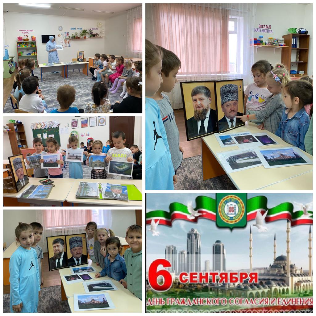 06.09.2022В рамках реализации нацпроекта проекта "Образование" в детском саду "Чебурашка" с. Закан-юрт06.09.2022 году воспитатель средней группы "Ласточки ‘’Сулейманова Д.И. провела тематическую беседу на тему: "6 сентября-День гражданского согласия и единения Чеченской Республики".