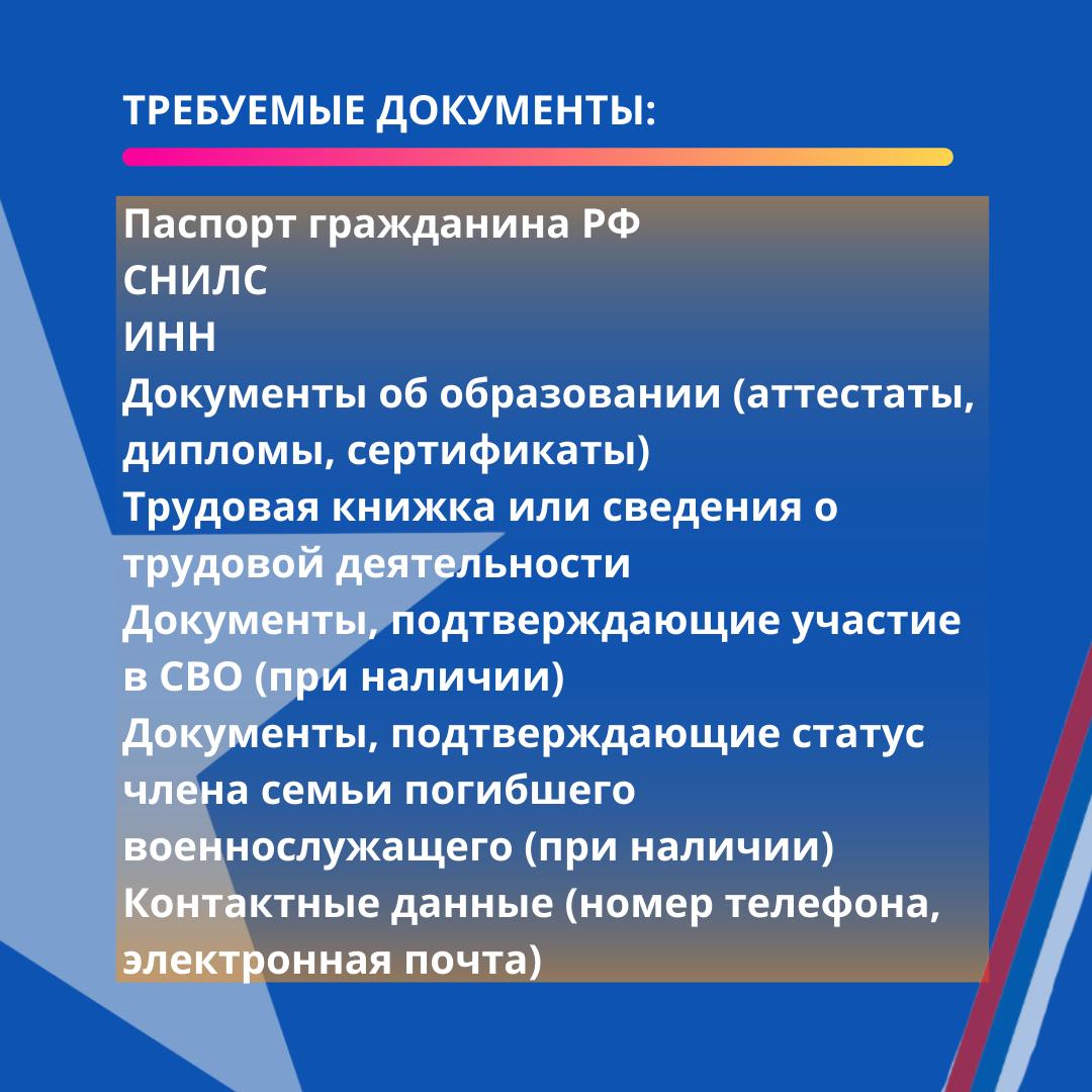 - паспорт гражданина Российской Федерации - СНИЛС - ИНН - документы об образовании - трудовую книжку или сведения о трудовой деятельности - документы, подтверждающие участие в СВО (при наличии) - документы, подтверждающие статус члена семьи погибшего военнослужащего (при наличии) - контактные данные (номер телефона, электронная почта)