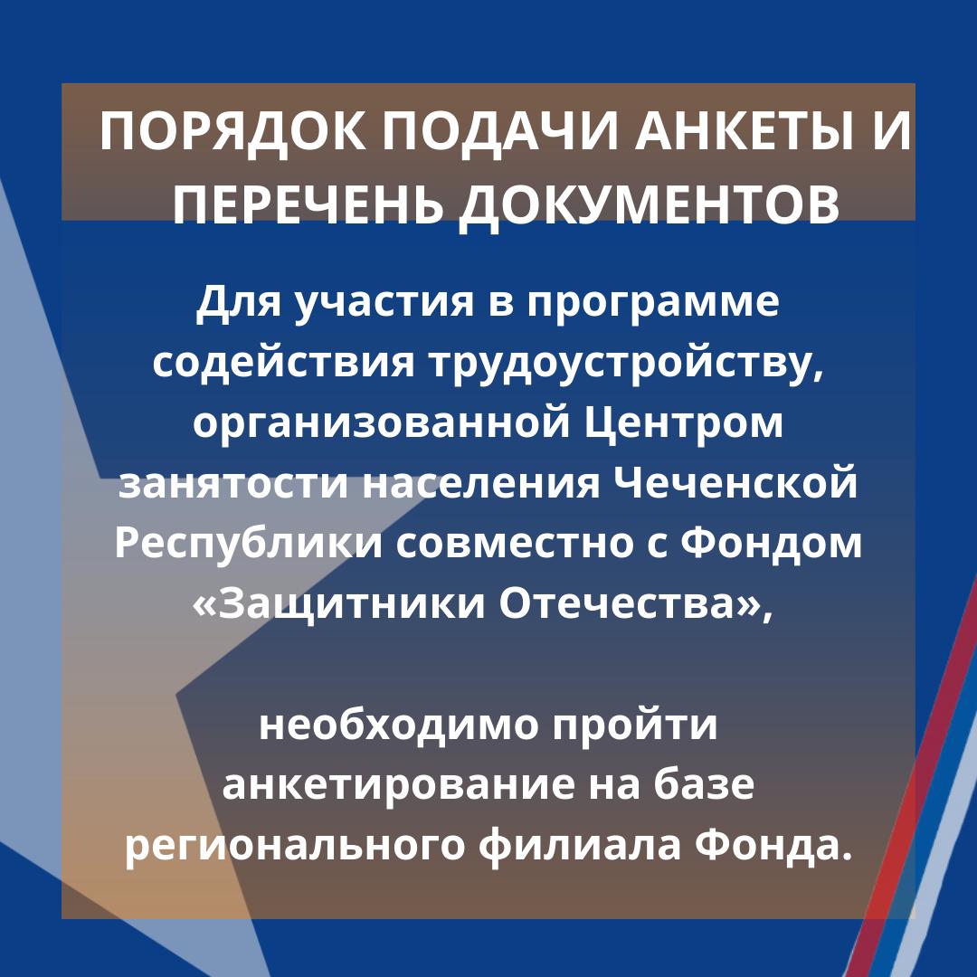 27.09.2025Филиал Государственного Фонда поддержки участников специальной военной операции «Защитники Отечества» в Чеченской Республике совместно с Государственным бюджетным учреждением «Управляющий Центр занятости населения» Министерства труда, занятости и социального развития ЧР объявляет о проведении мероприятия по содействию трудоустройству ветеранов СВО, демобилизованных военнослужащих и членов семей погибших защитников Отечества.